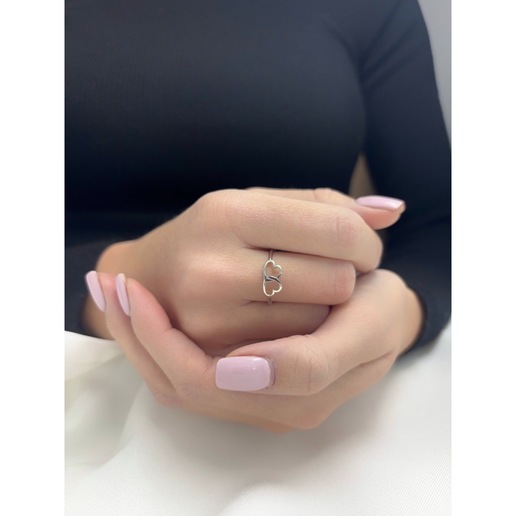 Jemný dámský prsten z bílého zlata se dvěma spojenými srdíčky.