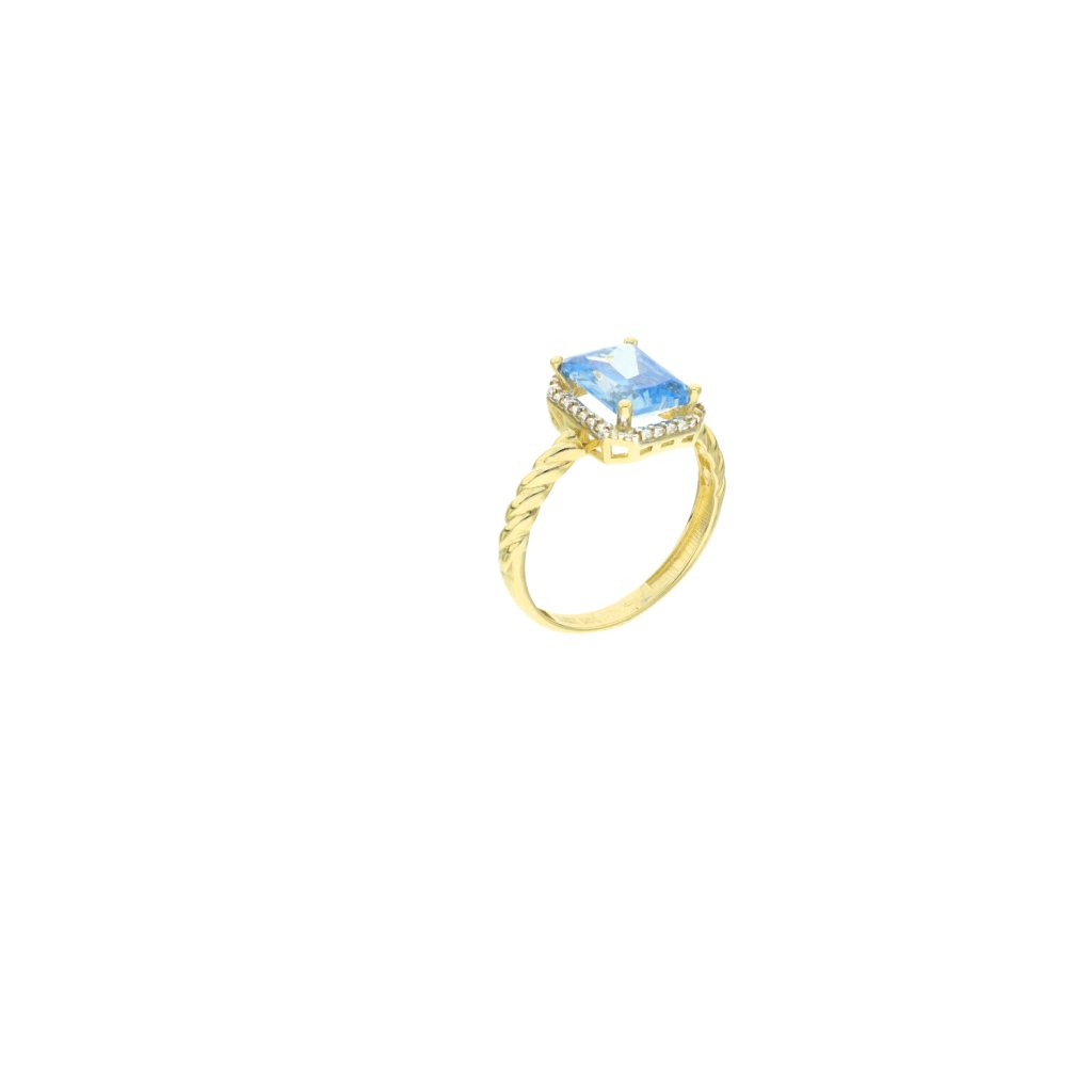 Zlatý dámský prsten s modrým kamenem zdobeným zirkony
