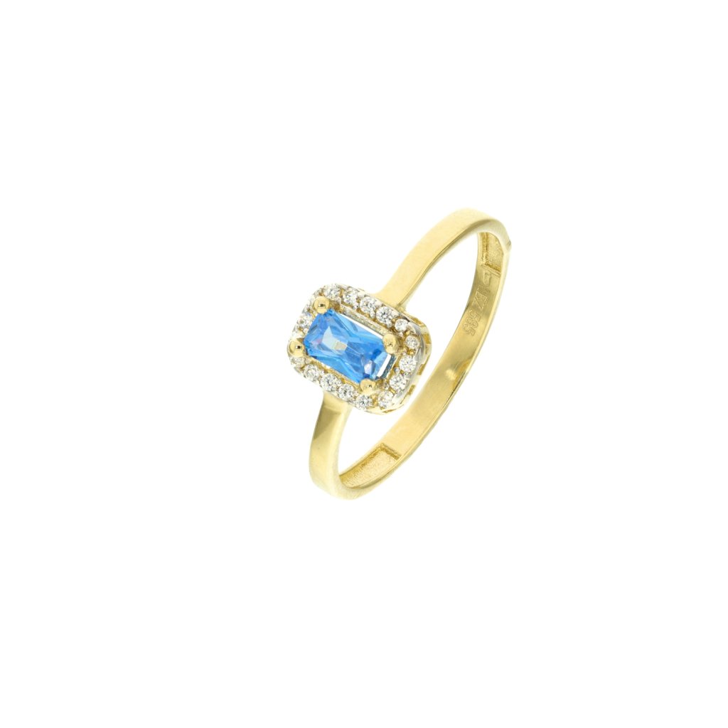 Zlatý dámský prsten zdobený modrým centrálním kamenem a zirkony