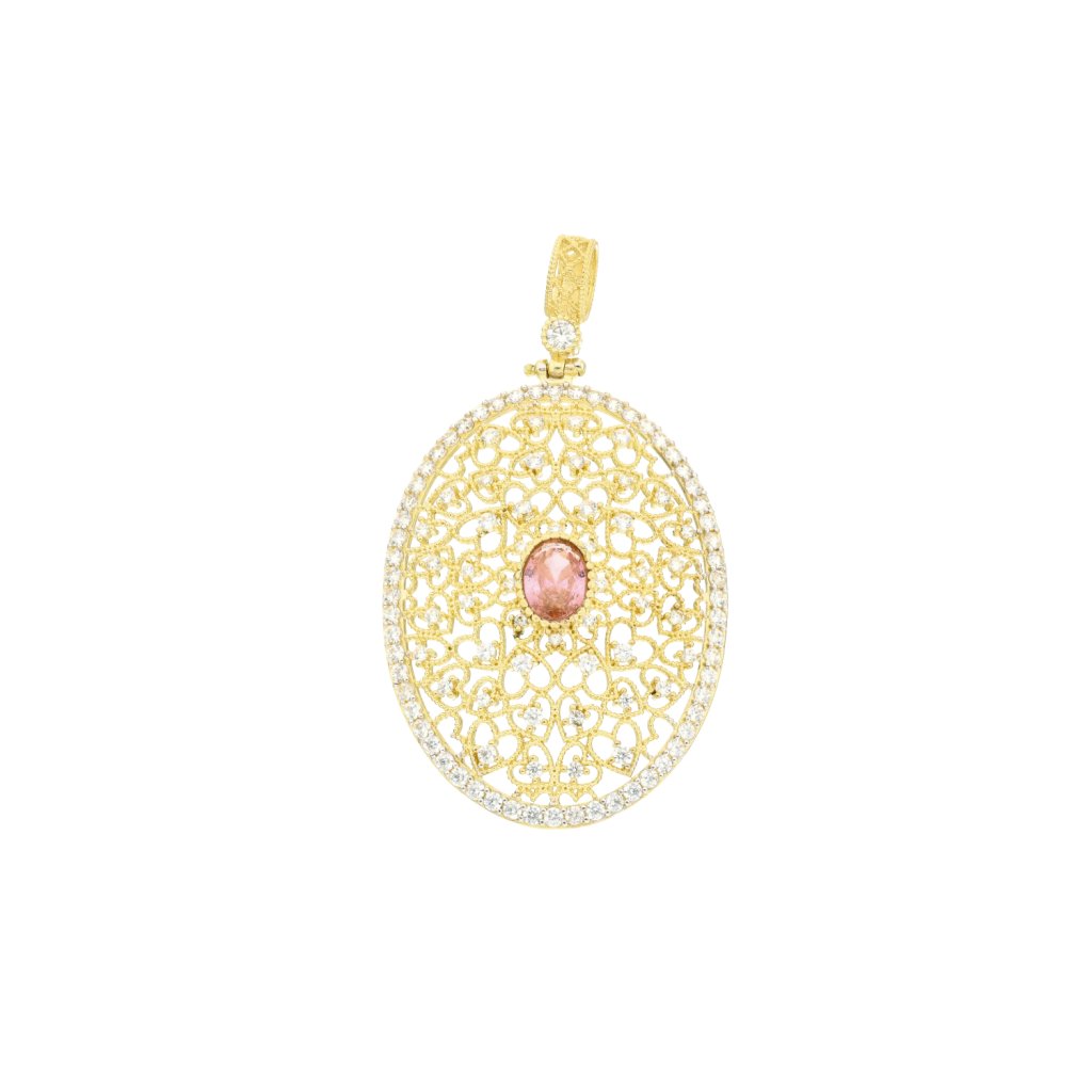 Zlatý nadčasový přívěsek s centrálním růžovým kamenem